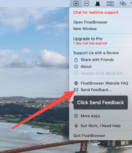 Click FloatBrowser icon from the menu bar, then click "Send Feedback"